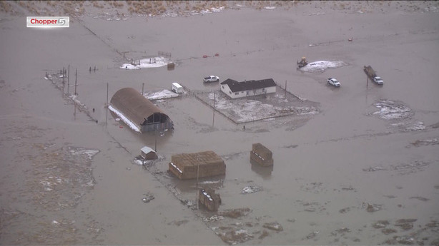 Fast-flowing water through the streets of Montello, an unincorporated community in Elko County in northeast Nevada, had emergency crews responding to set up sand bags around homes and businesses. Footage captured by KSL-TV’s Chopper 5 shows wide breaks in the earthen dam, water rushing along rail routes and trains stopped on the tracks.