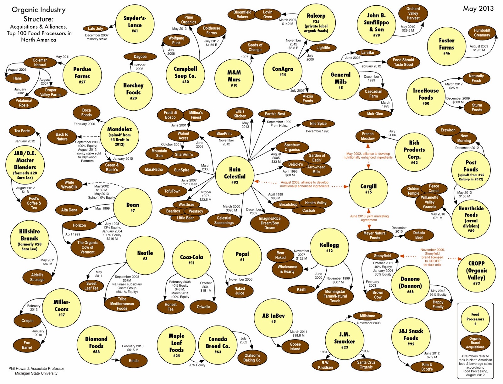 Those still looking to boycott the major food corporations by buying organic brands may find it increasingly difficult. The chart graphically focuses on the organic brands with ties to the top 100 food processors in North America.