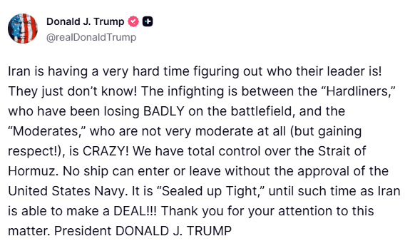 - Trump orders US Navy ‘shoot & kill’ small Iranian boats amid concern over mines in Hormuz. Says US now “doesn’t need a deal”.
