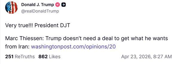 The below fresh Truth Social commentary also generally reflects recent reporting and the outlook of WaPo’s Marc Thiessen, of Iraq War infamy as a former longtime speechwriter for Donald Rumsfeld and President George W. Bush: